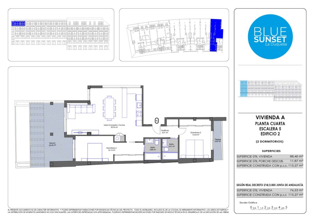 El residencial Blue Sunset está compuesto por 48 apartamentos de 2 y 3 dormitorios situados en un entorno privilegiado junto al campo de golf de La Duquesa, en Manilva. El residencial está formado por dos bloques de apartamentos con amplias terrazas y excelentes vistas al mar y al puerto de la Duquesa, las viviendas de la planta baja disponen de jardín privado.