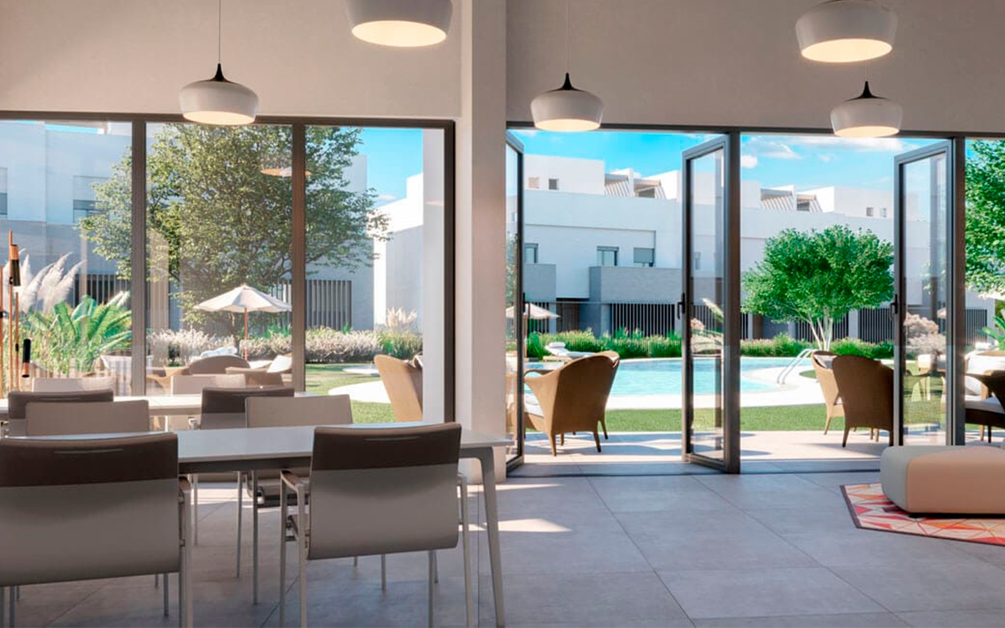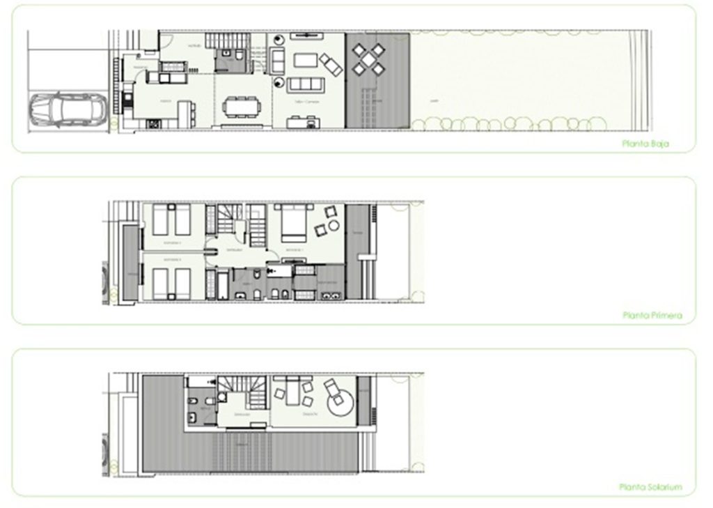 Al acceder a la planta baja nos recibe un espectacular salón – comedor con la cocina integrada. La luz inunda todo el espacio gracias a los grandes ventanales que dan acceso al porche y al jardín. En la primera planta están los dormitorios principales y según la tipología de la vivienda algunos disponen de una última planta con un magnífico solarium.